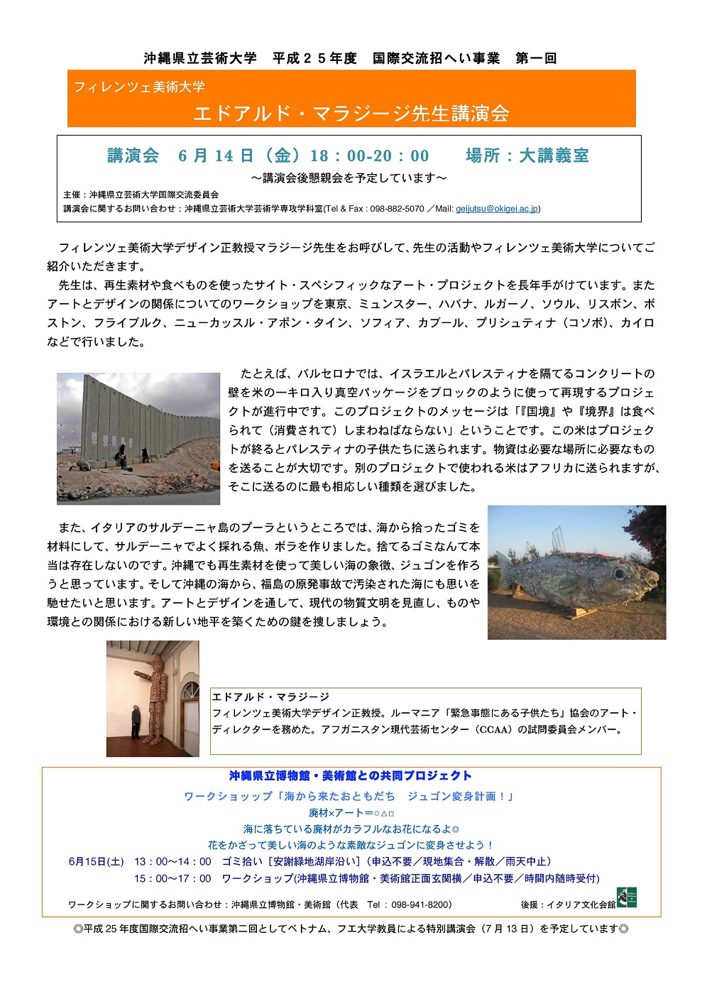 ワークショップに関するお問い合わせ:沖縄県立博物館・美術館(代表 Tel : 098-941-8200) 後援:イタリア文化会館